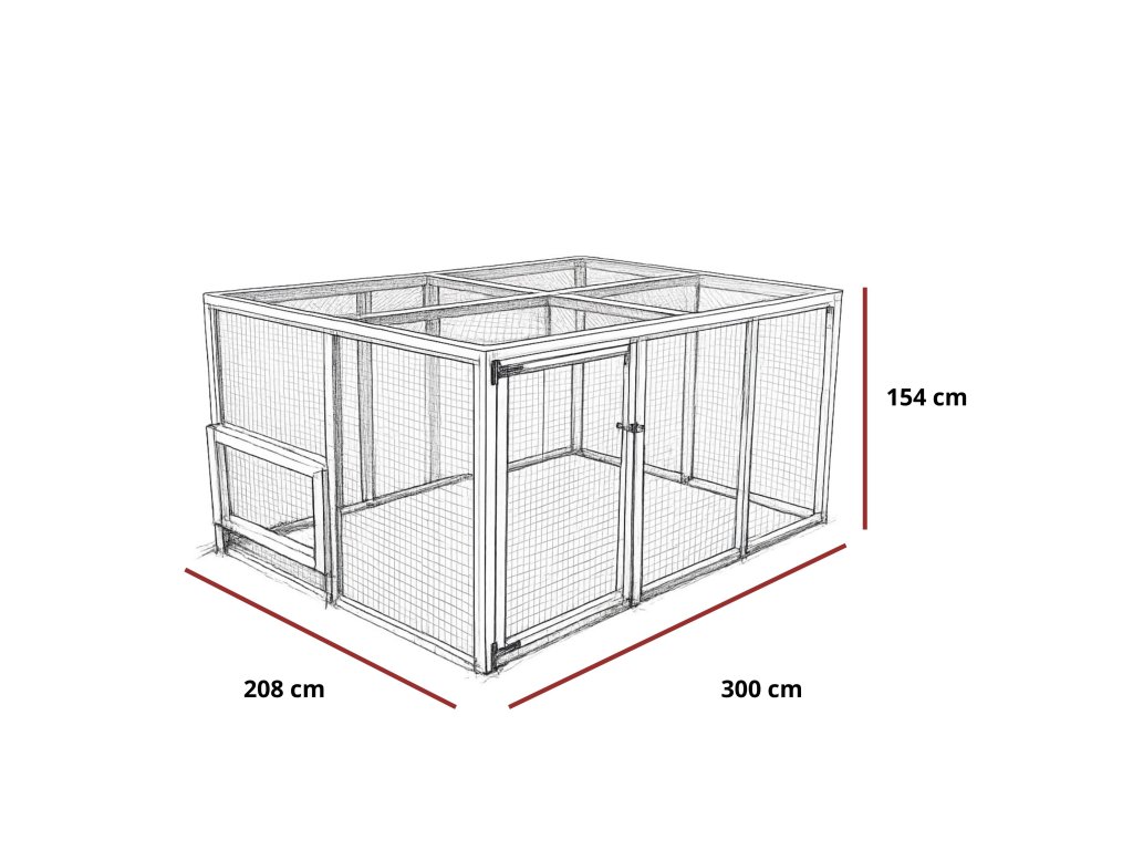 Rozměry sestaveného výběhu: 3 m (D) x 2,08 m (Š) x 1,54 m (V).