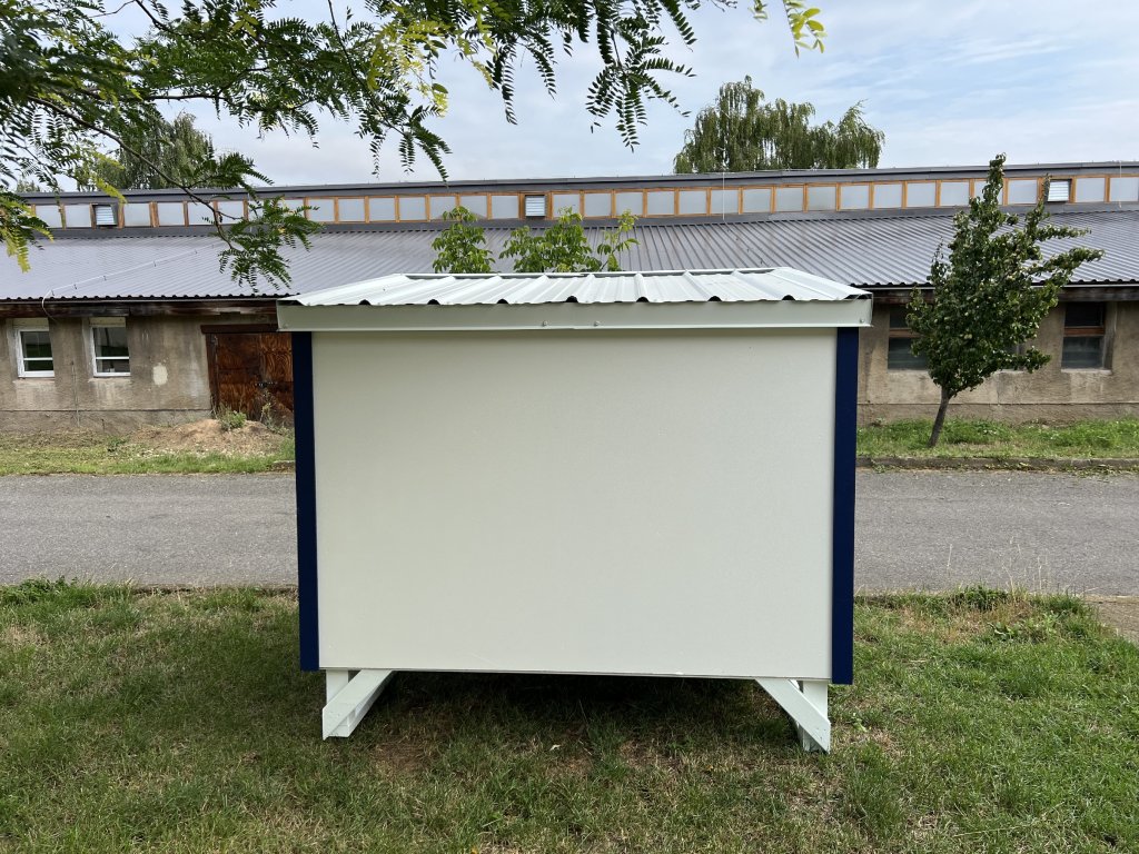 Alle Paneele und Verkleidungen werden lackiert und zusammengebaut, die gesamte Hardware wird installiert, Türen und Fenster werden installiert, Nistkästen werden montiert und Metall wird auf der Dachplatte installiert.
