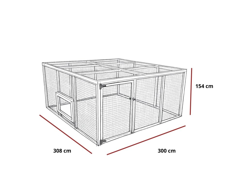 Dimensionen des zusammengebauten Hühnerauslauf: 3 m (L) x 3,08 m (B) x 1,54 m (H)