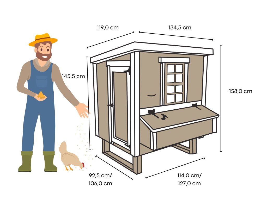 Dimensionen des zusammengebauten Hühnerstalls: 1,27 m x 1,33 m x 1,58 m (L x B x H) - inklusive Nistkasten