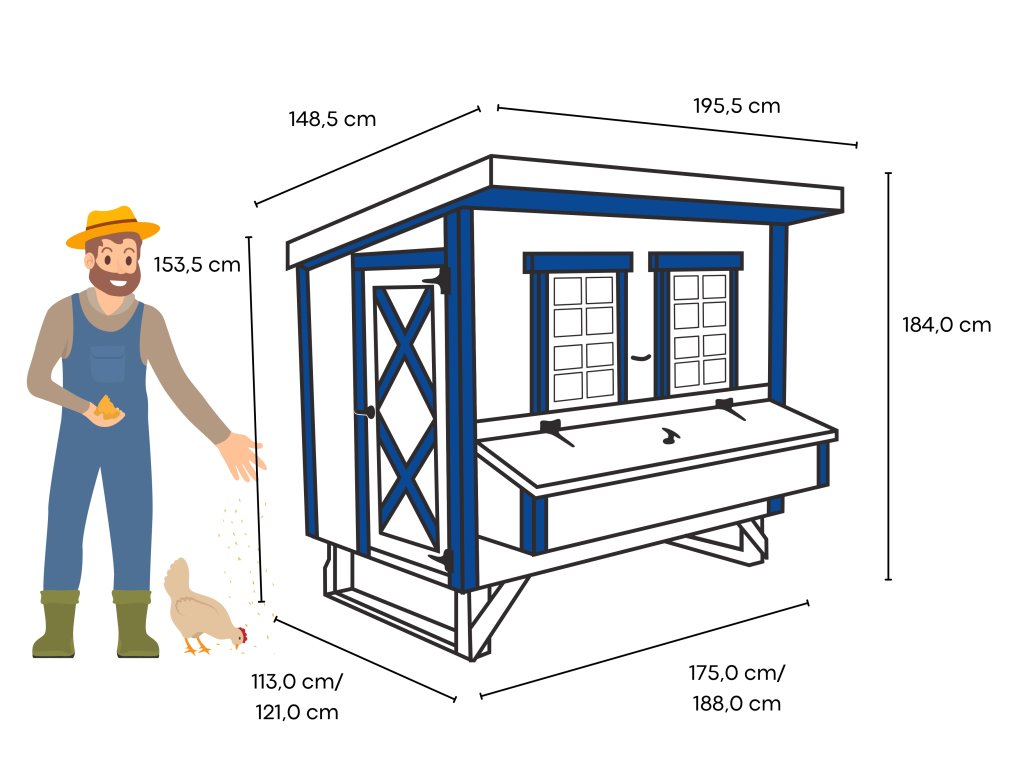 Dimensions of assembled coop: 1.88 m x 1.52 m x 1.84 m (L x W x H) - including nesting box