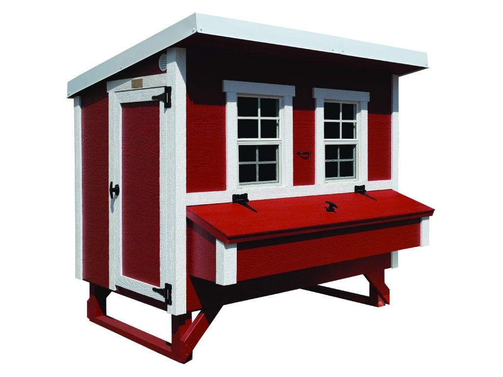 All panels and trim are painted and assembled, all hardware is installed, doors & windows are installed, nesting boxes are assembled, and metal is installed on the roof panel.