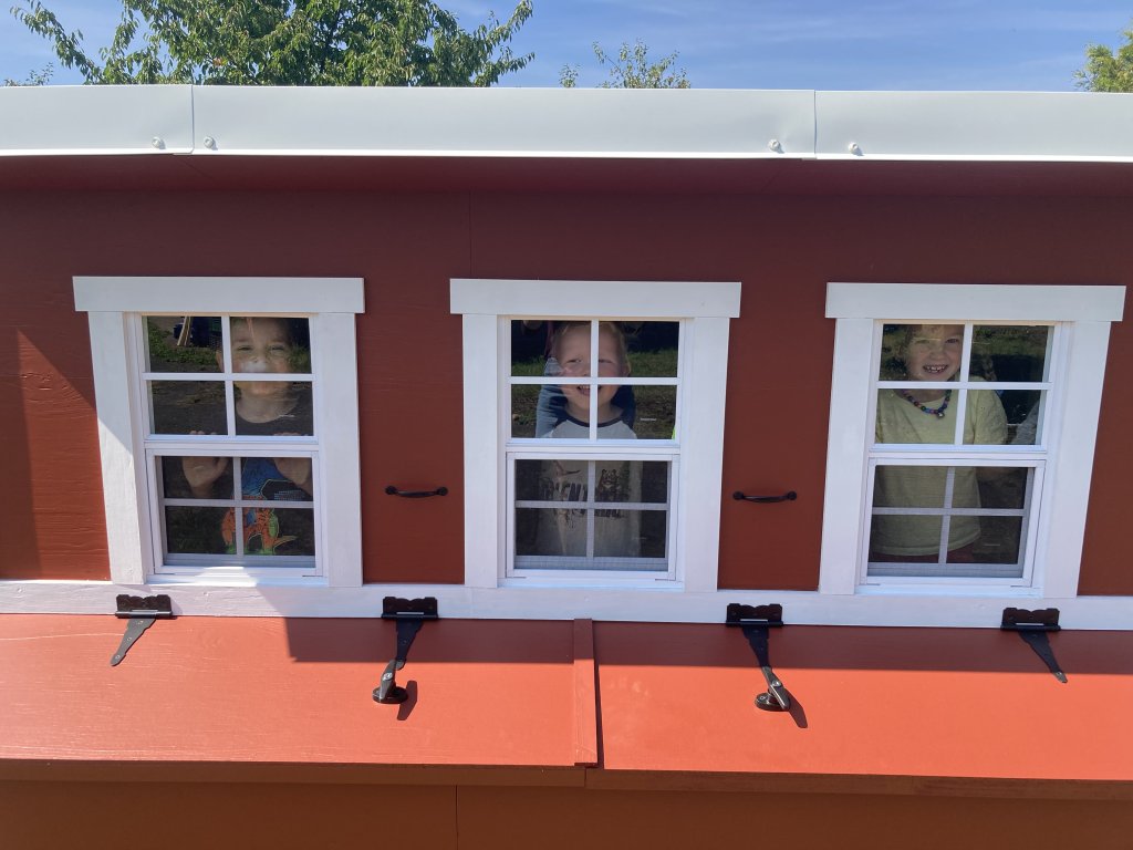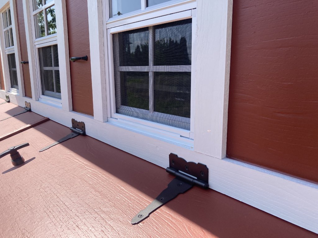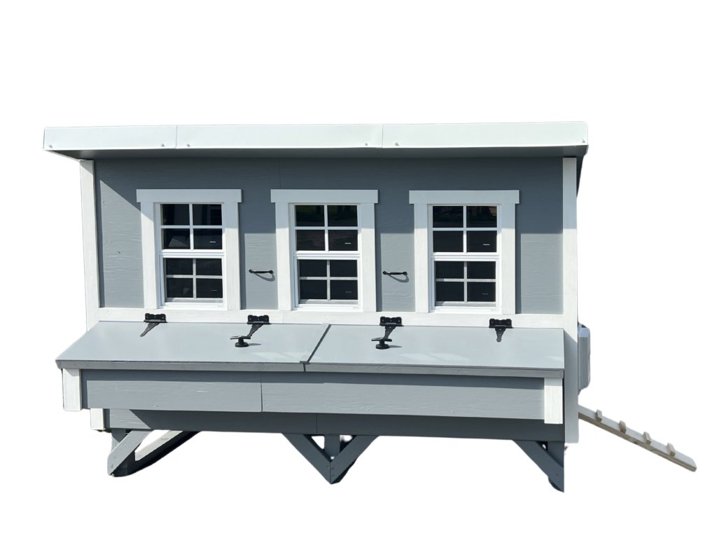 All panels and trim are painted and assembled, all hardware is installed, doors & windows are installed, nesting boxes are assembled, and metal is installed on the roof panel.